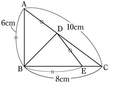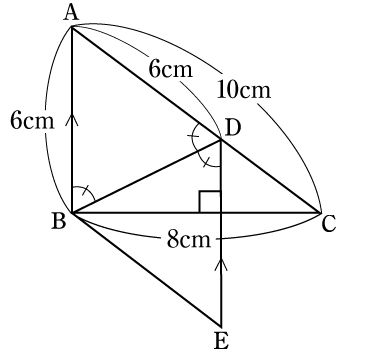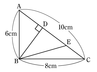 三角形ABCは,辺ABの長さが6cm,辺BCの長さが8cm,辺CAの長さが10cmであり,角Bの大きさが90゜の直角三角形です。辺CA上に点Dをとり,BDを折り目として下の図のように折ります。このとき,点Aが移動した点をEとします。