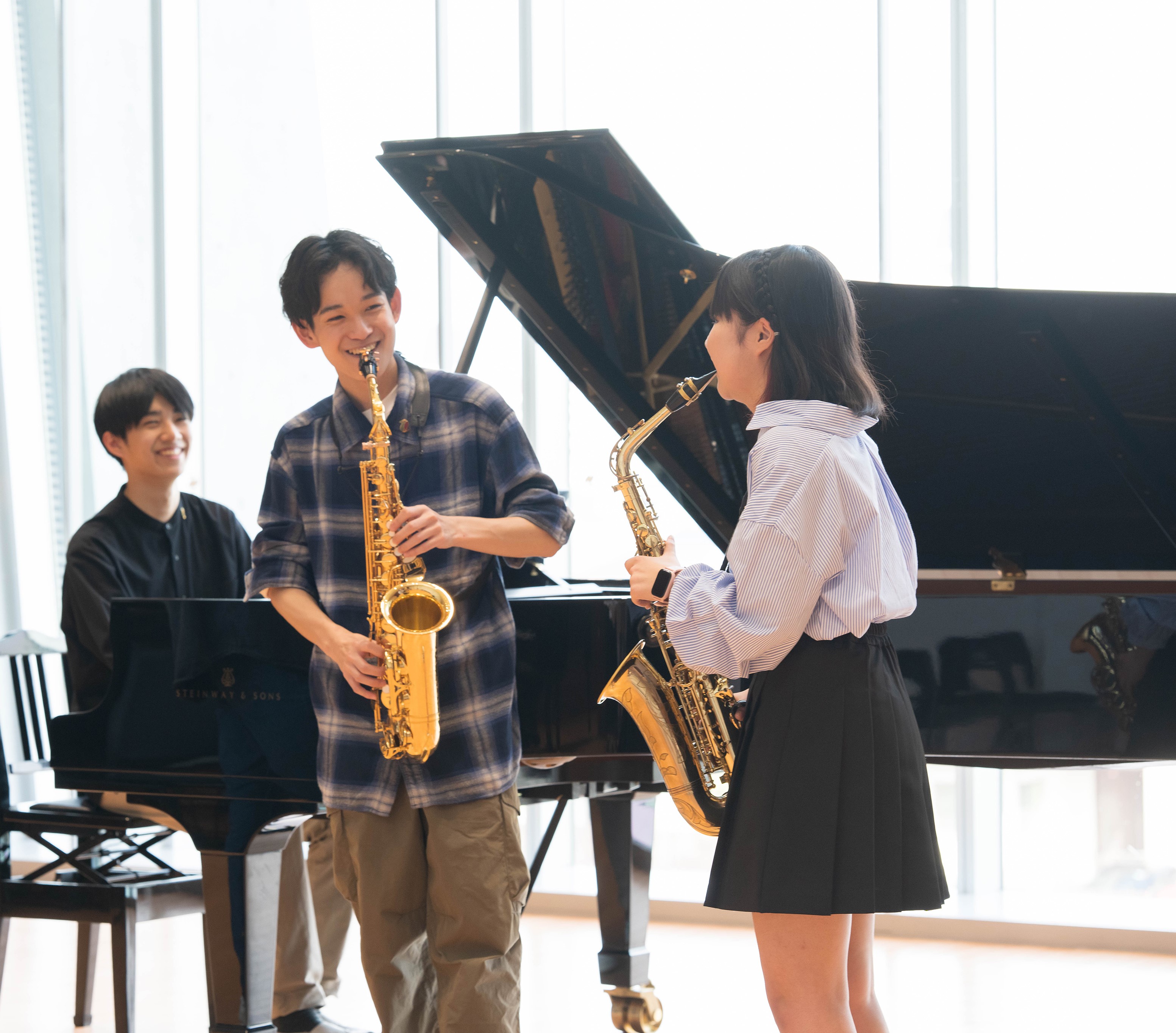 演奏会、合唱、アンサンブルなど、舞台に立つ経験が多い。自分の考えや感情を表現する力が自然と身につく。音楽を通して、協働性や責任感も育まれる。